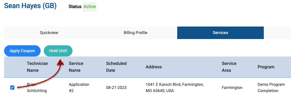 You may also place individual services On Hold from the customer's profile. Navigate to their profile and click on the Services tab. From here, you can check the box next to any service and click the Hold Until button at the top of the table.