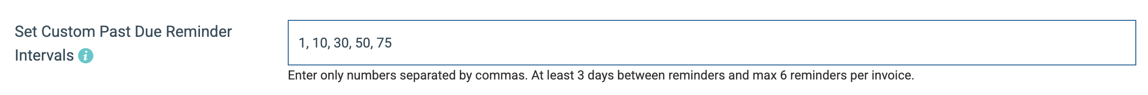 You can set a custom reminder schedule by filling out the days past due you would like those reminders to go out in the "Set Custom Past Due Reminder Intervals" section as seen below. You can enter a maximum of 6 reminders set at least 3 days apart.