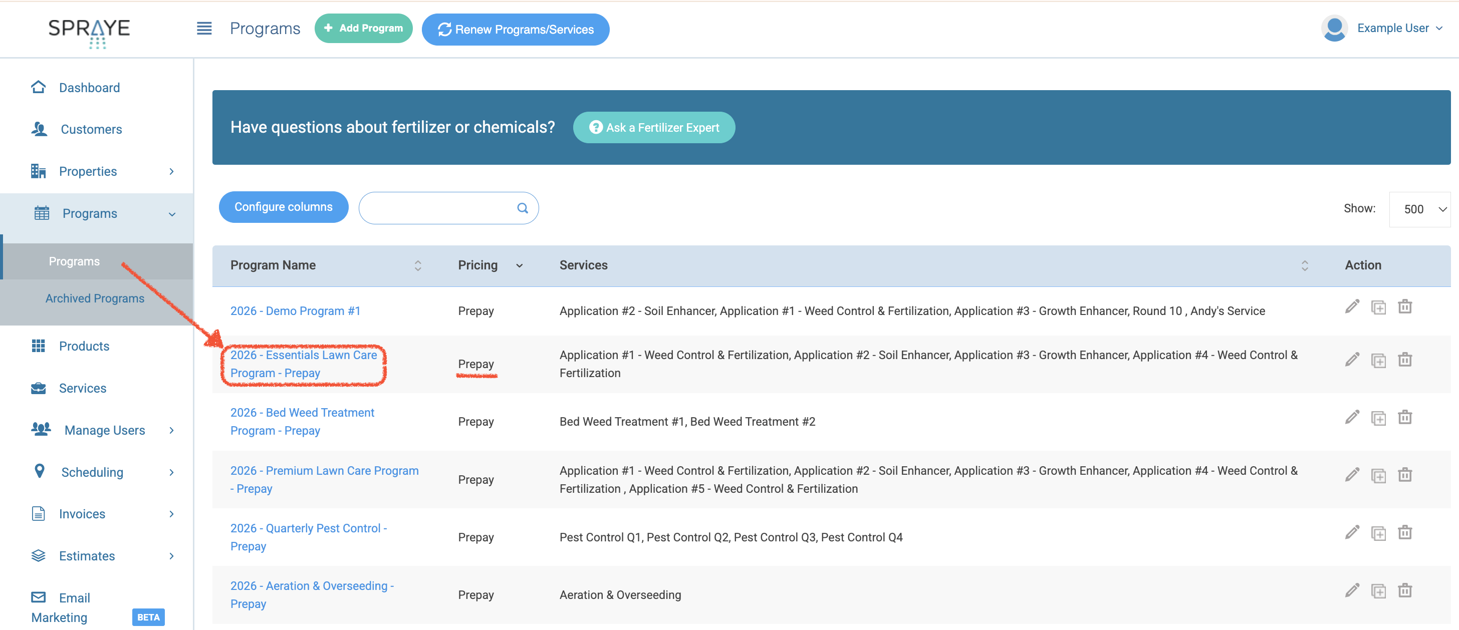 - Once saved, SPRAYE will automatically generate a prepay invoice for all the services within that program using the price override (if entered) for each service. You can then apply any prepay coupons necessary to the invoice and mark it paid from the Active Invoices screen.