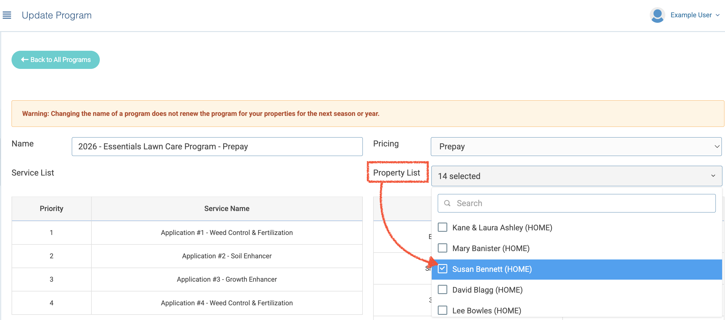 - Click on the Property List dropdown menu and select the customer's property:
