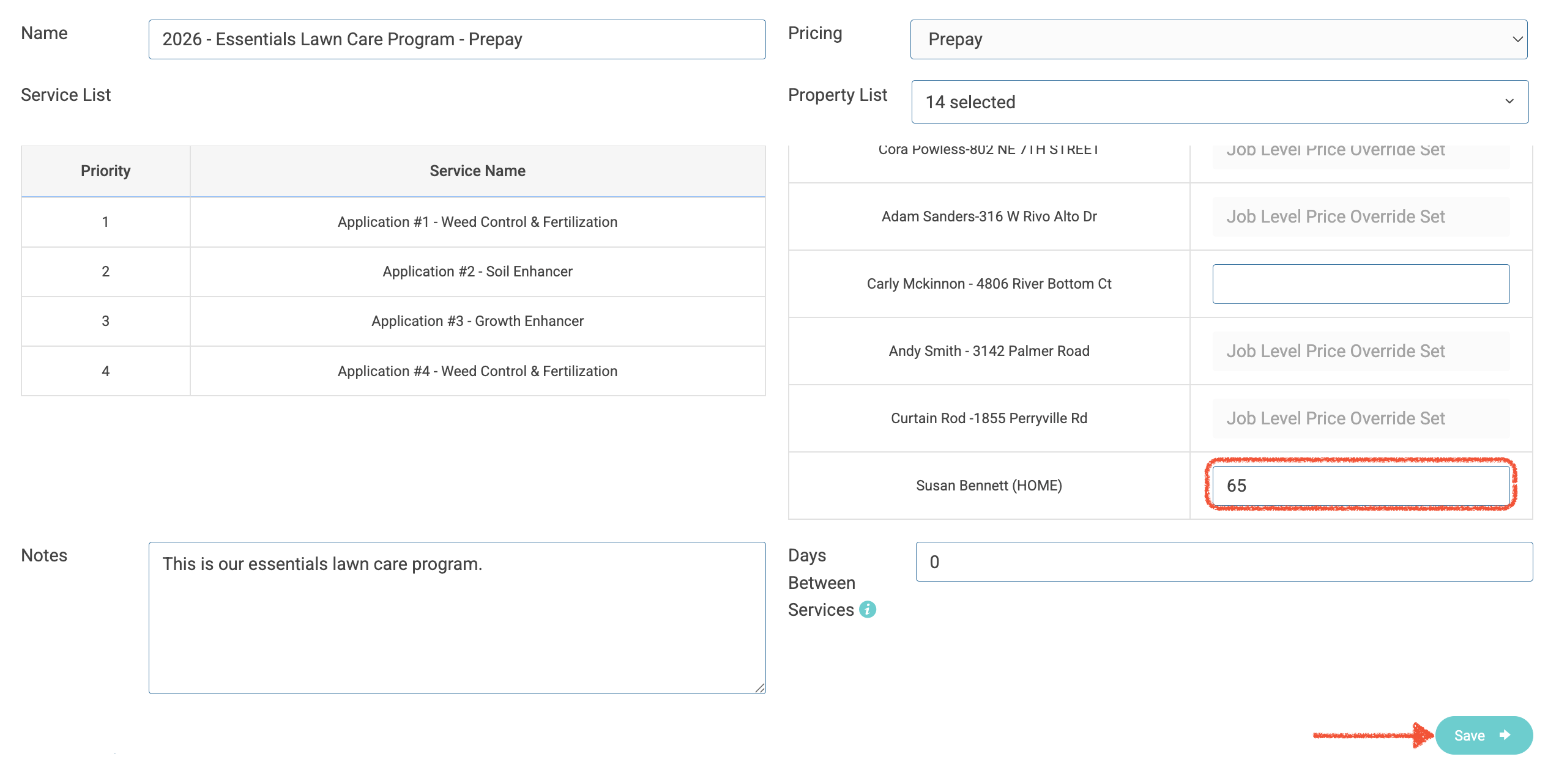 - Enter the price override per service (if needed) and click Save: